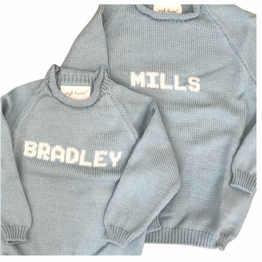 Roll Neck Name Sweater- Light Blue/White