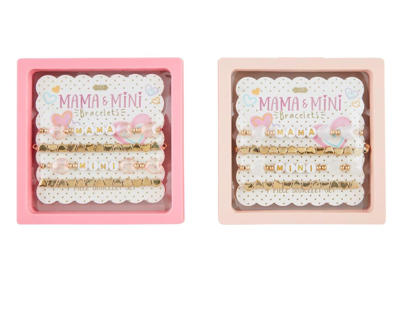4-piece set. Two mom sized stretch bead bracelets come with two coordinating mini styles on gift-ready packaging.